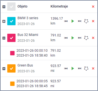 La lista de recorridos se encuentra en la parte izquierda de la ventana debajo del botón Mostrar recorrido. Cada línea contiene el nombre de la unidad, color del recorrido en el mapa (o el color de su primer segmento), kilometraje del intervalo indicado y el intervalo mismo. El kilometraje en recorridos puede diferenciar del kilometraje en informes si durante el intervalo indicado se han recibido datos no válidos. En estos casos el kilometraje de informes se considera más exacto.
