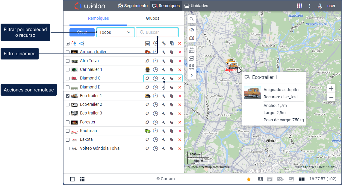 . Para facilitar la búsqueda del remolque necesario, emplee el filtro dinámico o filtro por propiedad (remolques no asignados o asignados) o por recurso.