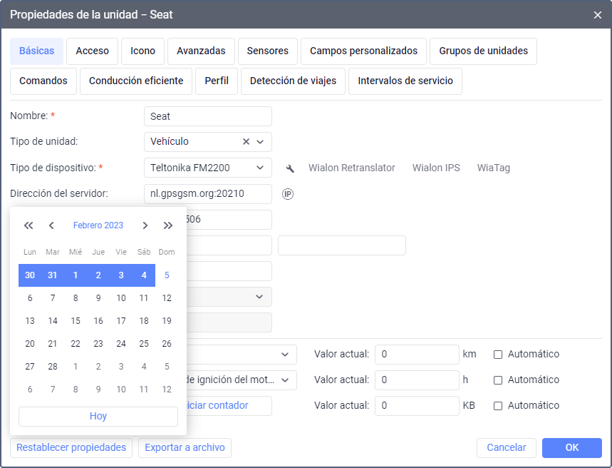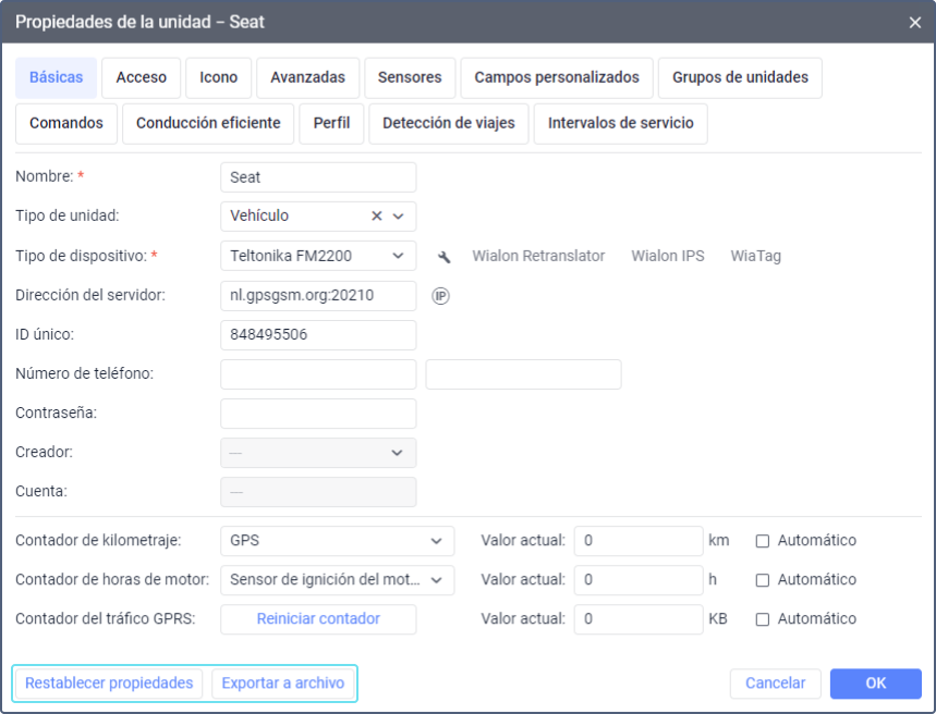 Los botones para restablecer y exportar las propiedades de la unidad se encuentran en la parte inferior de la pestaña Básicas.