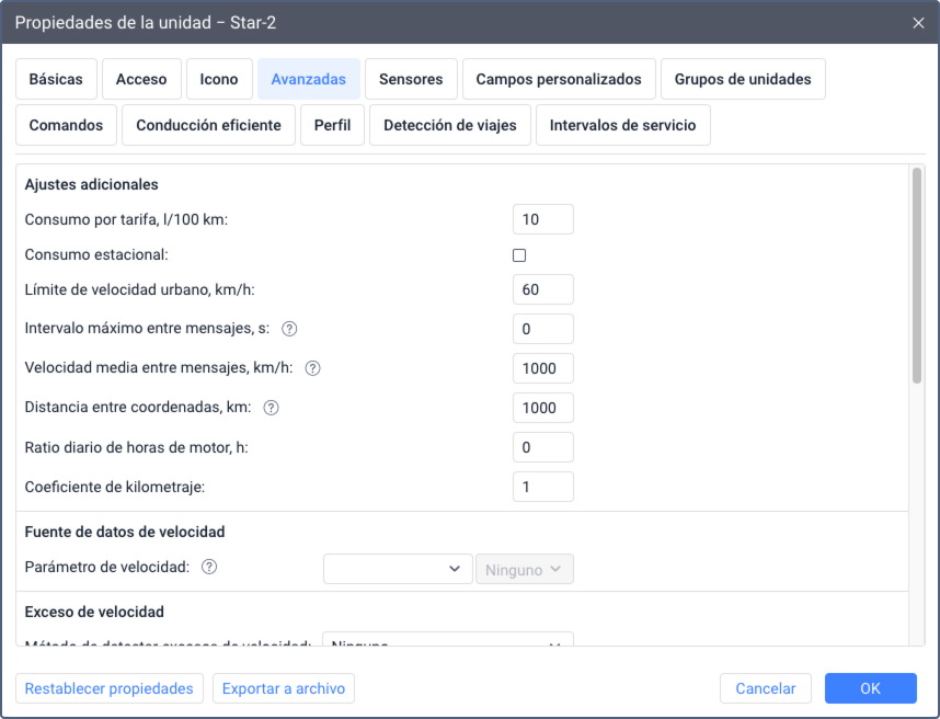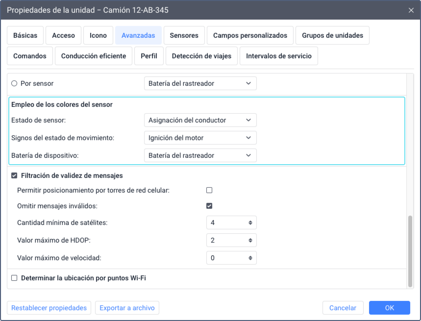 La pestaña Avanzadas se compone de varias secciones. En ellas puede configurar parámetros para ejecución de informes, coloración de recorridos y sensores, filtración de mensajes de unidades, etc.