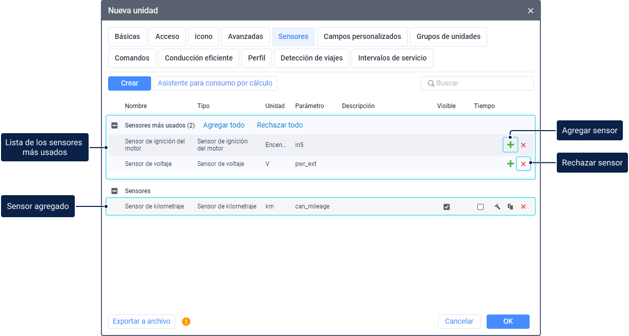 En esta pestaña puede crear, copiar y eliminar sensores de la unidad, configurar sus propiedades, visibilidad y orden. Asimismo, aquí está disponible la herramienta Asistente para consumo por cálculo.