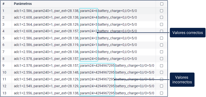 El análisis del parámetro permite ver si los valores del parámetro se muestran incorrectamente. Si es así, en vez de números negativos se muestran valores positivos compuestos por una gran cantidad de dígitos.