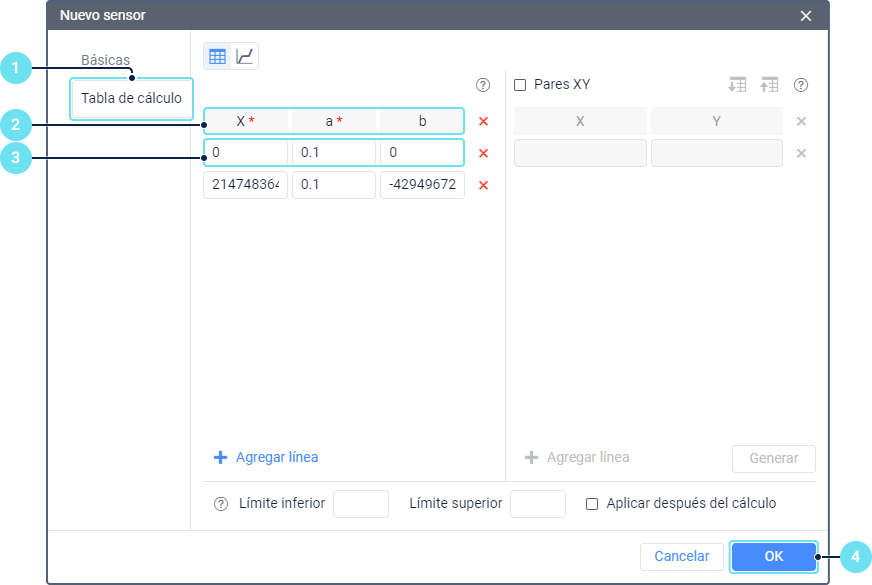 Abra la pestaña Tabla de cálculo en las propiedades del sensor.