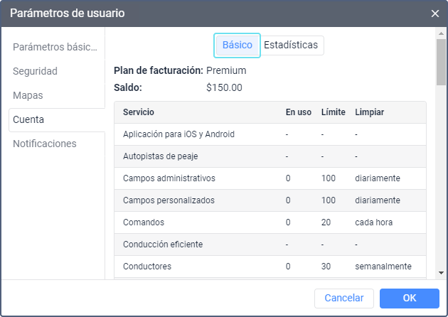 En la sección Básico, se muestra el nombre del plan de facturación, el saldo de la cuenta y la tabla de servicios disponibles. Si para la cuenta está activado el bloqueo por días, se muestra también la cantidad de los días restantes.