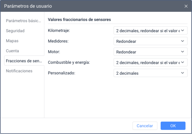Se puede ajustar el formato de valores fraccionarios para sensores de los grupos Kilometraje, Medidores, Motor, Combustible y energía, así como para el sensor personalizado.