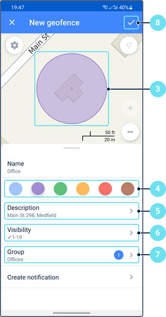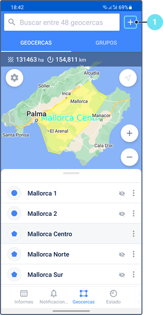 En la aplicación móvil, se puede crear solo geocercas-círculos. Para crear una geocerca, realice los siguientes pasos: