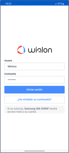Para iniciar sesión por primera vez, autorícese en la aplicación. Para hacer esto, apriete Entrar como otro usuario (si la lista está vacía, apriete Iniciar sesión), introduzca el nombre de usuario de Wialon y la contraseña, y apriete Autorizar. En caso de una autorización exitosa, se abre la página con las unidades disponibles para el seguimiento. Para iniciar sesión la próxima vez, simplemente seleccione la cuenta necesaria de la lista de las disponibles en la página de inicio. Para eliminar una cuenta de la lista, apriete el icono