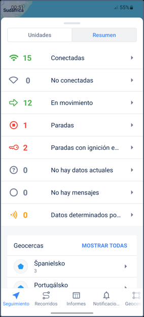 Los datos del resumen están organizados en categorías, cada una mostrando el número de unidades que tienen un estado específico. Para ver la lista de unidades, pulse sobre cualquier categoría. Desde la lista de unidades, puede acceder a la información detallada e historia de la unidad y abrir el menú de unidad.