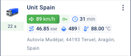 En la pestaña Seguimiento, los datos más recientes de unidades, como velocidad, duración del viaje, nivel de combustible, valores de los sensores, ubicación, se muestran en la ficha de unidad. Esta información está disponible en la lista de trabajo de unidades e información detallada de la unidad.