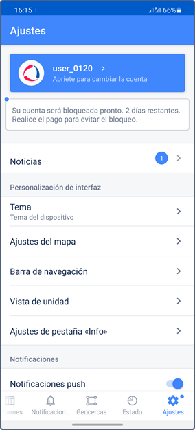 En la pestaña Ajustes puede leer las noticias, modificar los parámetros de la interfaz. mapa y notificaciones, cambiar la cuenta o salir de la aplicación, ver la lista de posibles problemas y sus soluciones, así como abrir la documentación de la aplicación.