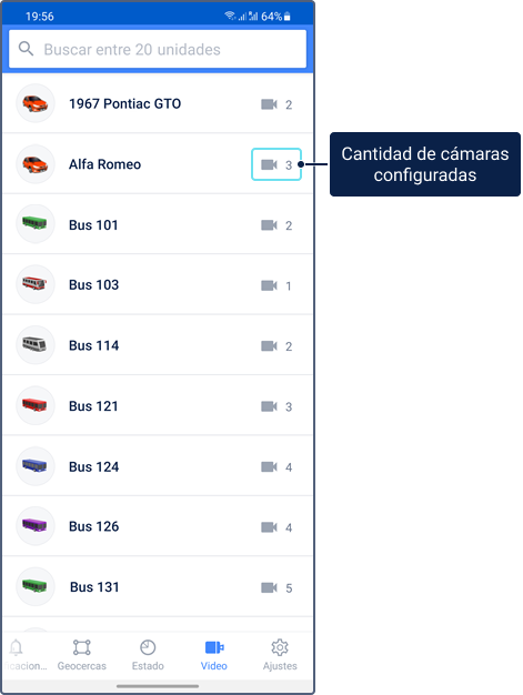 La pestaña contiene la lista de unidades que tienen las cámaras configuradas. Se puede configurarlas en el sistema de seguimiento en la pestaña Vídeo de las propiedades de la unidad o en la aplicación móvil en los ajustes de las cámaras en la pestaña En directo. Al lado del nombre de cada unidad se muestra el icono