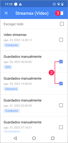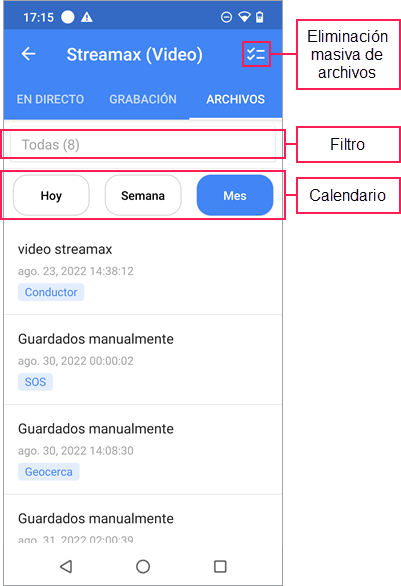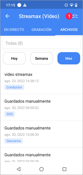 La lista contiene todos los archivos guardados de una unidad. Si un archivo se ha guardado por medio de una notificación, tiene el mismo nombre que la notificación. Si el usuario ha guardado los archivos manualmente, estos se llaman Guardados manualmente. Los archivos están ordenados por fecha y hora del evento. Debajo de la fecha y hora se muestra la etiqueta del tipo de evento (si está indicada).