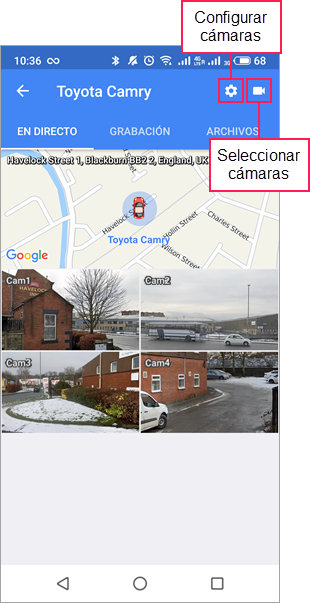 en el rincón superior derecho de la pantalla. Aquí se muestran todas las cámaras de la unidad configuradas para ver transmisiones en directo, recibir grabaciones y guardar archivos.