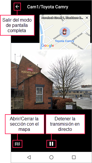 Apriete dos veces la sección con la transmisión en directo para pasar a pantalla completa. En el modo de pantalla completa también está disponible la sección con el mapa centrado en la posición de la unidad. Si es necesario, se puede mover esta sección hacia la derecha o izquierda en la parte superior o inferior de la pantalla.
