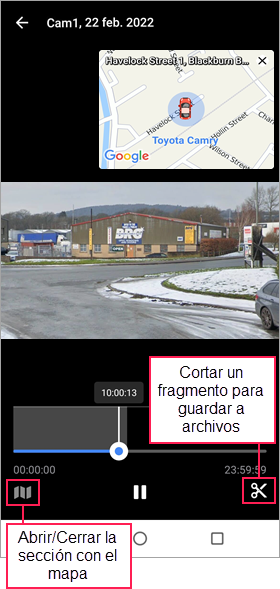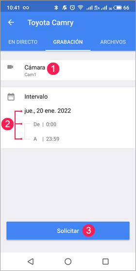 En esta pestaña se puede obtener y ver vídeos del período pasado grabados por las cámaras de la unidad (grabaciones) y guardar fragmentos necesarios como archivos.