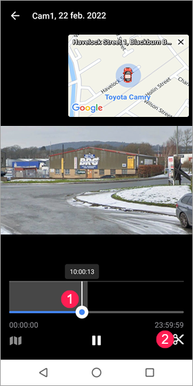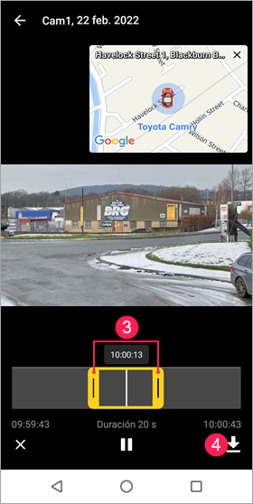 3. Especifique la duración antes y después del evento por medio de los controles deslizantes a la izquierda y la derecha. La duración mínima posible es 2 segundos; la máxima, 60 segundos. La duración del archivo que se guarda resulta de la suma de los segundos antes y después del evento y se muestra encima de la línea de tiempo.