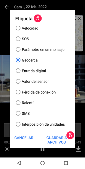 El fragmento necesario de la grabación puede ser guardado como un archivo que se hace disponible en la pestaña Archivos. Los archivos guardados también están disponibles en la versión web de Wialon en la pestaña del mismo nombre, en los mensajes e informes.