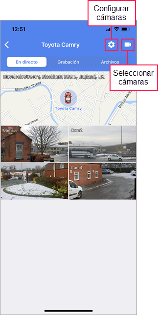 en el rincón superior derecho de la pantalla. Aquí se muestran todas las cámaras de la unidad configuradas para ver transmisiones en directo, recibir grabaciones y guardar archivos.