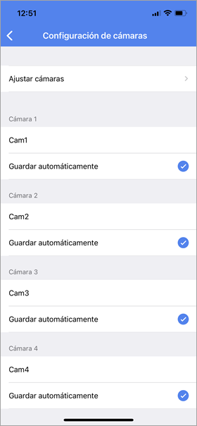 Si la lista no contiene todas las cámaras necesarias o contiene las que no hacen falta, apriete Ajustar cámaras y active o desactive las cámaras necesarias con el interruptor. La cantidad máxima de cámaras para una unidad es 16.
