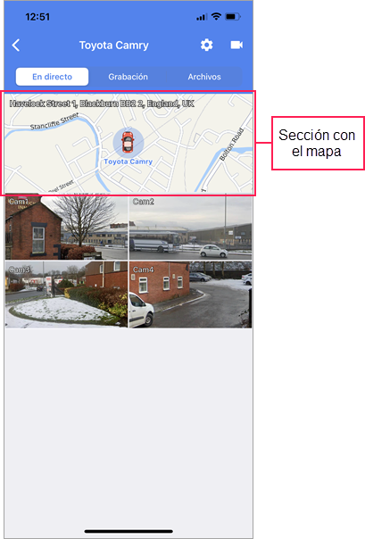 En esta pestaña se puede ver transmisiones en directo de las cámaras de la unidad, seguir su movimiento en el mapa y configurar cámaras.