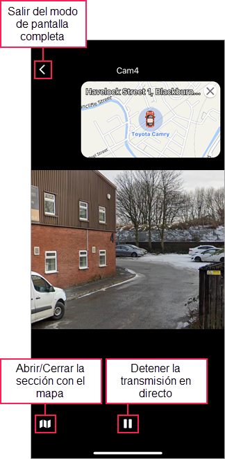 Apriete dos veces la sección con la transmisión en directo para pasar a pantalla completa. En el modo de pantalla completa también está disponible la sección con el mapa centrado en la posición de la unidad. Si es necesario, se puede mover esta sección hacia la derecha o izquierda en la parte superior o inferior de la pantalla.