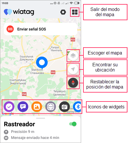En el modo Mapa se puede ver la ubicación de usted. Además, aquí se muestran funciones de los widgets disponibles para el usuario.