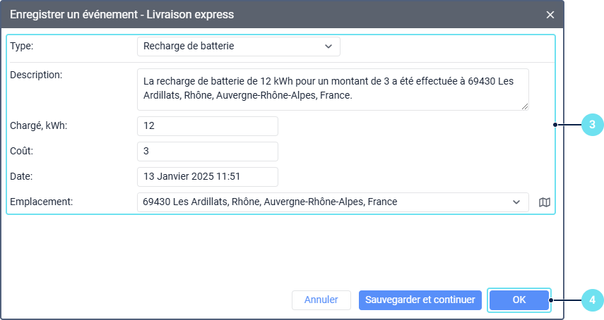 - Dans la fenêtre, sélectionnez le type de Recharge de batterie, indiquez le montant et le coût de la charge, ainsi que l’emplacement de l’unité pendant la charge. Les champs Description et Date sont remplis automatiquement, mais vous pouvez les modifier si nécessaire.
