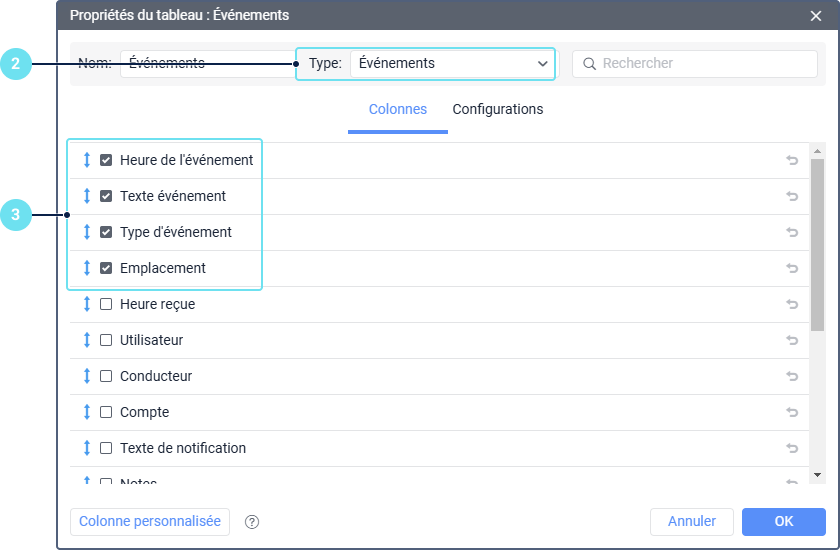 Pour afficher les données relatives aux charges dans le tableau Événements, procédez comme suit :
