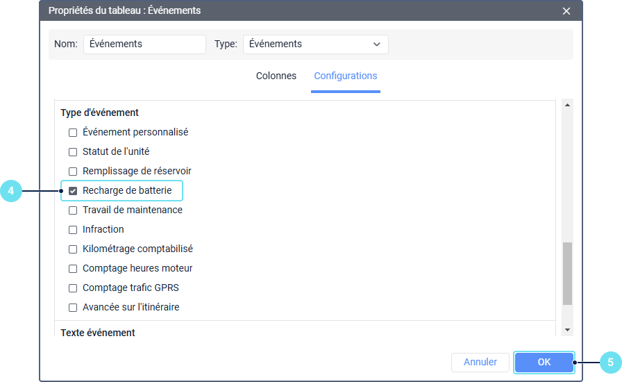 Emplacement. L’emplacement spécifié lors de l’enregistrement de la charge. - Dans le filtre Événement de l’onglet Configurations, sélectionnez Recharge de batterie pour n’afficher que ces événements dans le tableau.