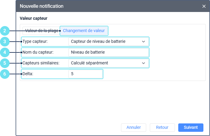 - Dans le champ Delta, indiquez de combien la valeur du capteur doit changer pour que la notification soit déclenchée.