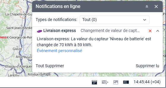 La charge de la batterie est définie comme une augmentation du niveau de la batterie d’un montant supérieur à la valeur spécifiée dans le champ Recharge minimum dans les propriétés du capteur.