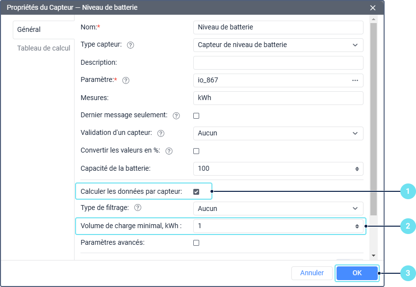 - S’il y a plusieurs capteurs de niveau de batterie, indiquez s’il faut additionner les changements de leurs valeurs ou prendre en compte la valeur de chaque capteur séparément.