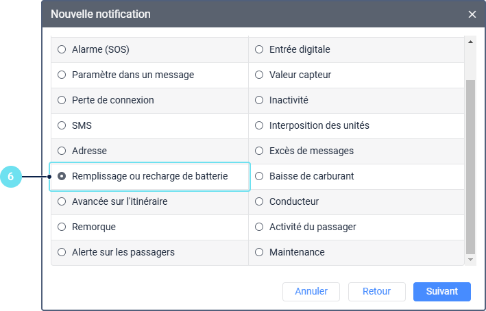 Le système de suivi vous permet de configurer les notifications suivantes concernant l’état de charge de la batterie :