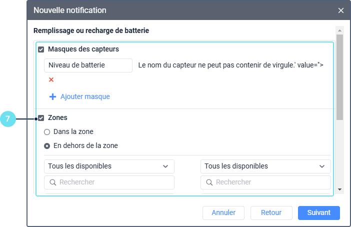 Pour configurer une notification qui doit être déclenchée lorsque le capteur de niveau de batterie envoie certaines valeurs, par exemple lorsque le niveau de charge est inférieur à celui souhaité, procédez comme suit :