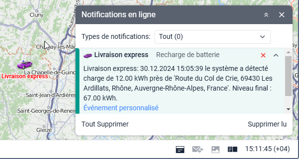 Si l’option Ignorer les données recalculées est activée, la notification n’est envoyée qu’une seule fois après la détection de la charge de la batterie. Si l’option est désactivée, la notification peut être déclenchée plusieurs fois si des modifications de données ont permis de détecter la charge de la batterie, ou si d’autres modifications ont été apportées aux données de charge (par exemple, le volume). - Sélectionnez une ou plusieurs actions à effectuer après que la notification a été déclenchée. Vous pouvez recevoir des notifications par SMS et e-mail ou les consulter en ligne dans une fenêtre pop-up, etc. Vous pouvez également enregistrer un événement sur la charge dans l’historique de l’unité en utilisant l’action Enregistrer l’événement pour l’unité. Veuillez noter que certaines actions peuvent nécessiter des droits d’accès et des services supplémentaires. Pour plus d’informations, consultez la page Actions de notifications.