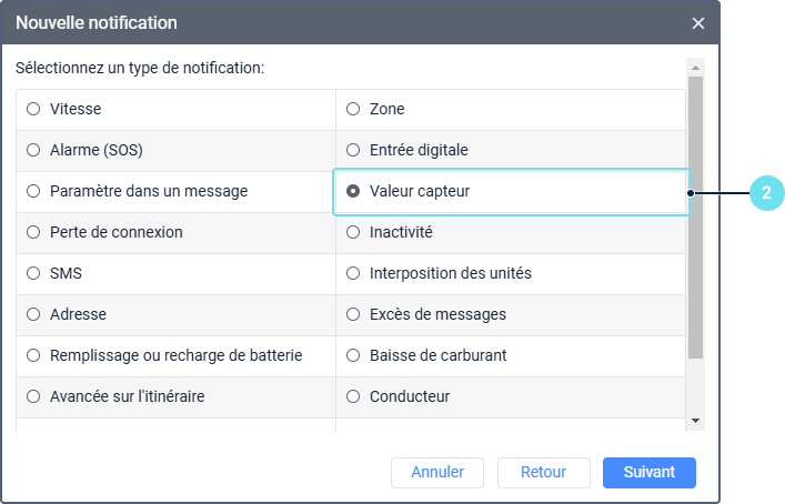 Dans l’onglet Notifications, cliquez sur Nouveau. Sélectionnez la ressource où la notification doit être stockée, l’unité pour laquelle vous souhaitez tracer la modification de la lecture du capteur, puis sélectionnez le type de notification **Valeurs capteur.
