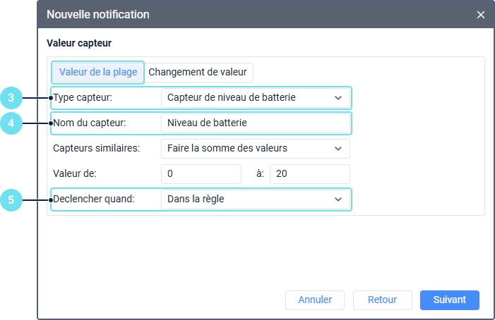 Dans l’exemple ci-dessus, la notification doit être déclenchée si la valeur du capteur se situe dans l’intervalle de 0 à 20 kWh.