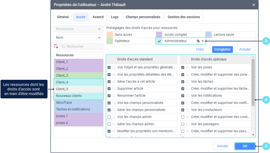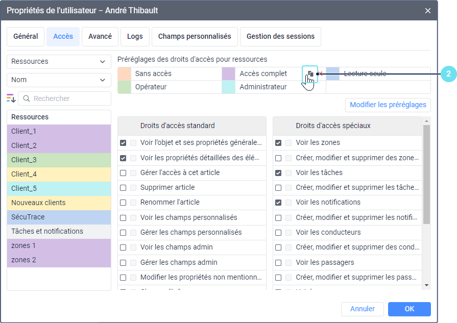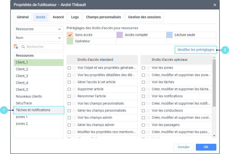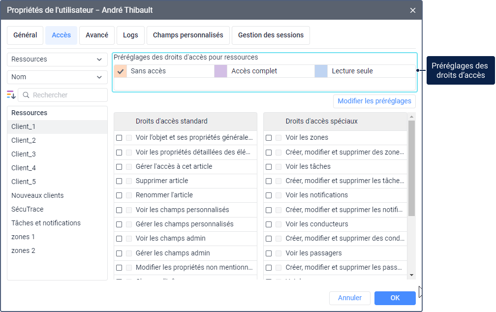 Dans l’exemple suivant, nous modifions le préréglage dans les propriétés de l’utilisateur qui dispose des droits d’accès à l’objet. Il est également possible de modifier le préréglage depuis les propriétés de l’objet auquel l’accès est attribué (sauf pour les itinéraires et les utilisateurs).