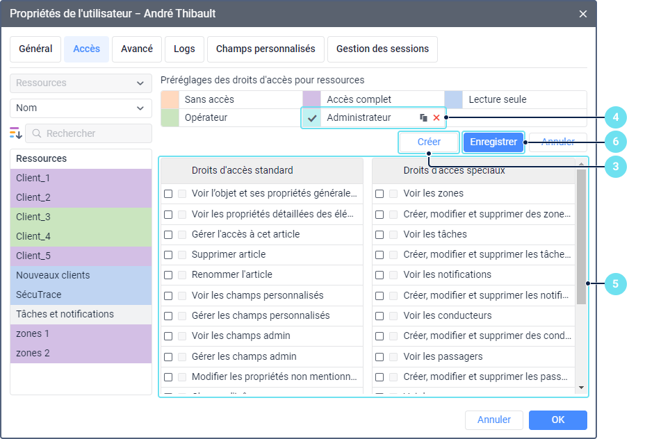 Dans l’exemple ci-dessous, nous créons un préréglage dans les propriétés de l’utilisateur qui doit obtenir les droits d’accès à une ressource. Vous pouvez également créer un préréglage à partir des propriétés de la ressource, c’est-à-dire de l’objet auquel l’utilisateur doit avoir accès (à l’exception des itinéraires et des utilisateurs).