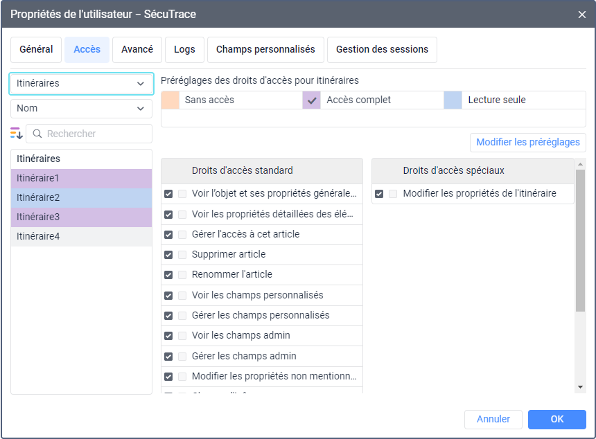 Les droits d’accès standard qui peuvent être attribués aux utilisateurs sur les itinéraires sont décrits ci-dessous.
