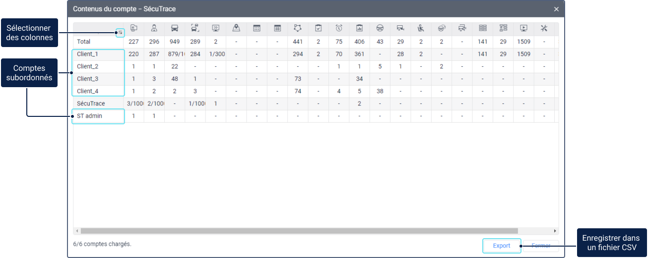 Le tableau peut afficher le nombre maximum d’objets s’il existe certaines restrictions pour le compte en fonction des services activés. Par exemple, si le compte contient 3 itinéraires alors que le nombre maximum autorisé est de 10, la ligne de ce compte (la colonne Itinéraires) affichera 3/10.
