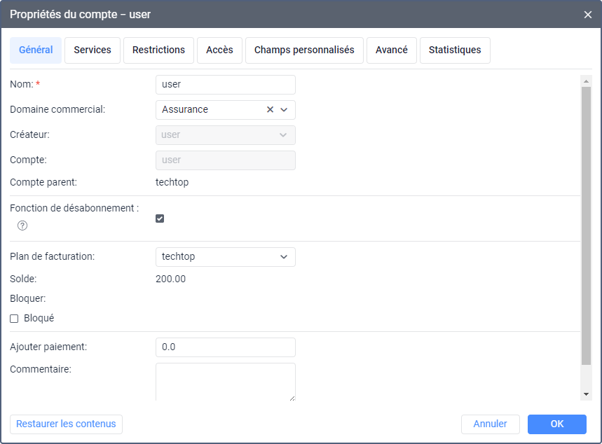 Les propriétés du compte s’ouvrent si vous cliquez sur le nom du compte dans la liste. Cette fenêtre peut afficher jusqu’à sept onglets, selon vos droits d’accès au compte. Elle contient également le bouton Restaurer le contenu qui permet de restaurer les micro-objets appartenant à la ressource du compte.
