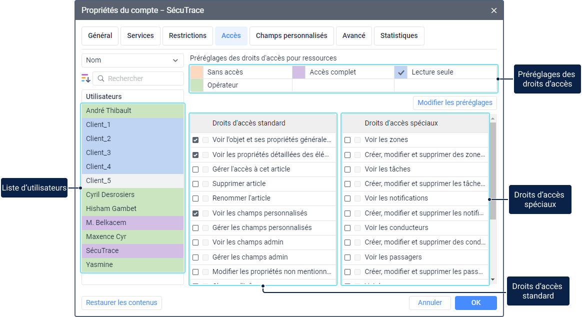 Dans la partie gauche de la fenêtre, vous pouvez voir la liste des utilisateurs auxquels vous pouvez attribuer des droits d’accès au compte. Les noms des utilisateurs qui disposent d’au moins un de ces droits sont surlignés en couleur.