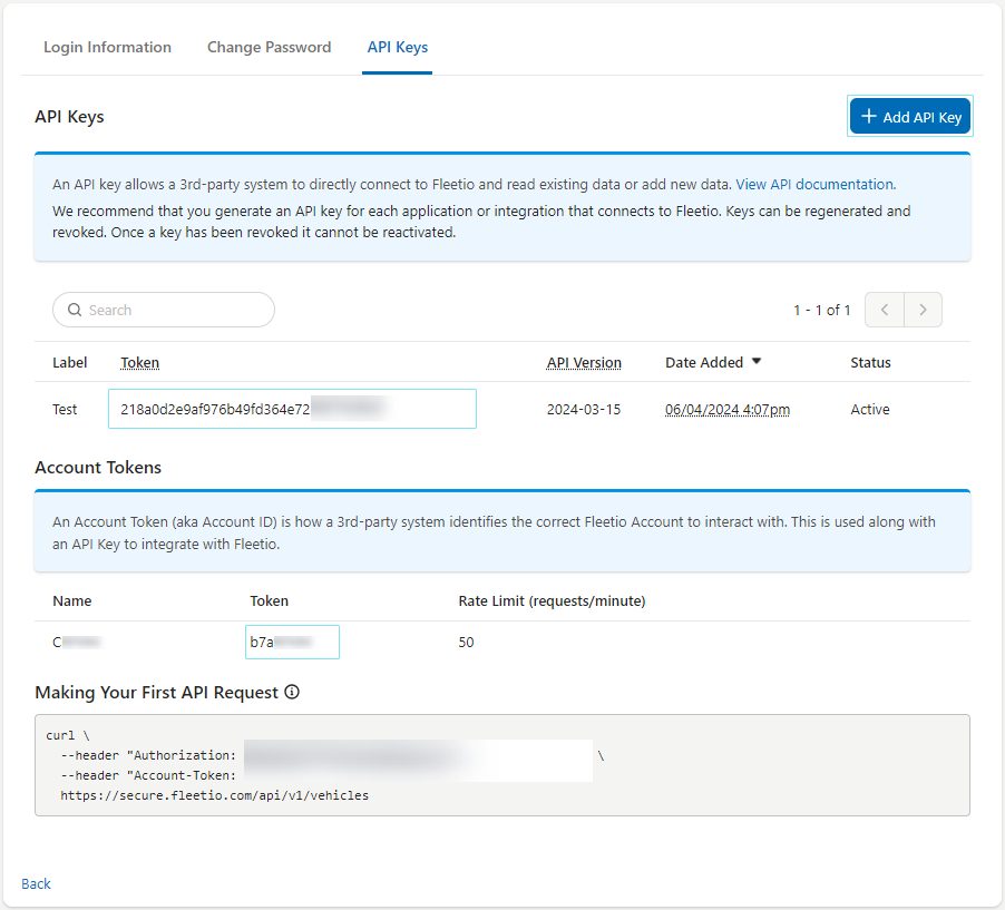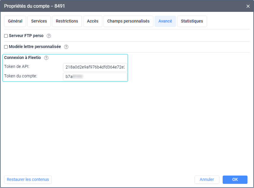- Dans l’onglet Avancé, sous Connexion à Fleetio, collez les tokens copiés dans les champs API token et Account token.