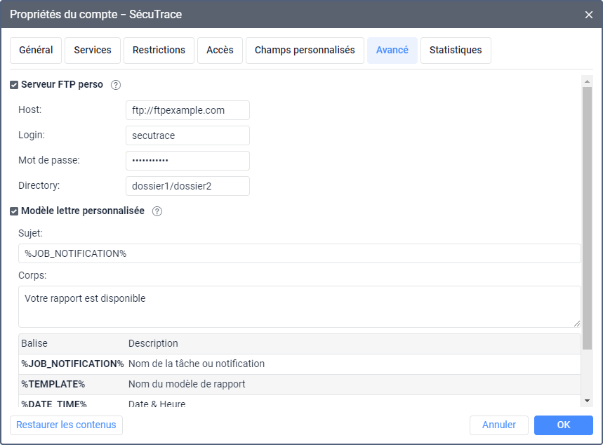 Pour spécifier le sujet et le texte du message envoyé par e-mail à la suite d’une tâche ou d’une notification, activez l’option Modèle de lettre personnalisé et renseignez les champs Sujet et Corps. Le corps du message peut contenir des balises qui sont converties en valeurs réelles au moment de l’envoi. Cliquez sur une balise pour l’ajouter au texte.
