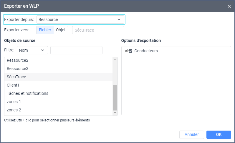 Vous pouvez exporter le contenu d’une ressource vers une autre ressource ou l’enregistrer dans un fichier WLP à l’aide de l’outil d’importation et d’exportation.