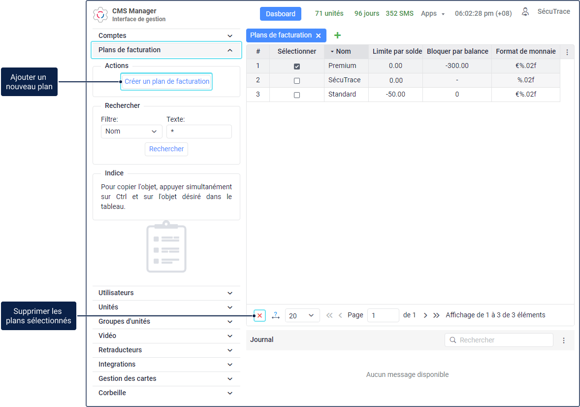 Pour travailler avec des plans de facturation, accédez à la section Plans de facturation dans le volet de navigation de CMS Manager. Ici, vous pouvez créer, modifier et supprimer des plans de facturation ainsi que les rechercher par nom.