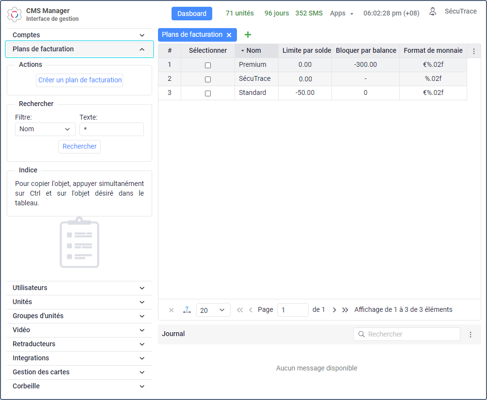 Un plan de facturation est attribué à tous les comptes du système Wialon. Il est employé pour limiter les actions des utilisateurs et pour facturer les services.