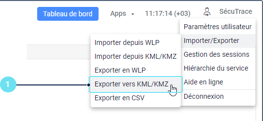 Dans le menu de l’utilisateur, sélectionnez Importer/Exporter et cliquez sur Exporter vers KML/KMZ.
