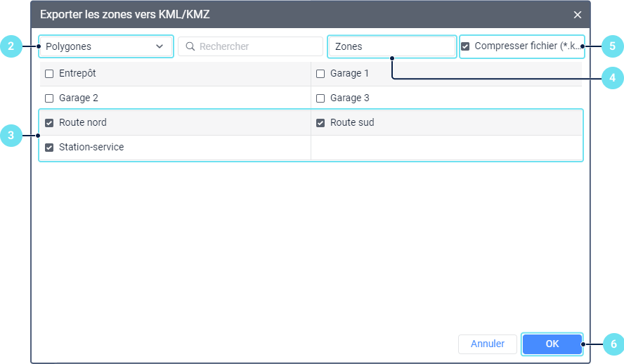 Utilisez l’option Compresser le fichier pour enregistrer les zones au format KMZ compressé, si nécessaire.